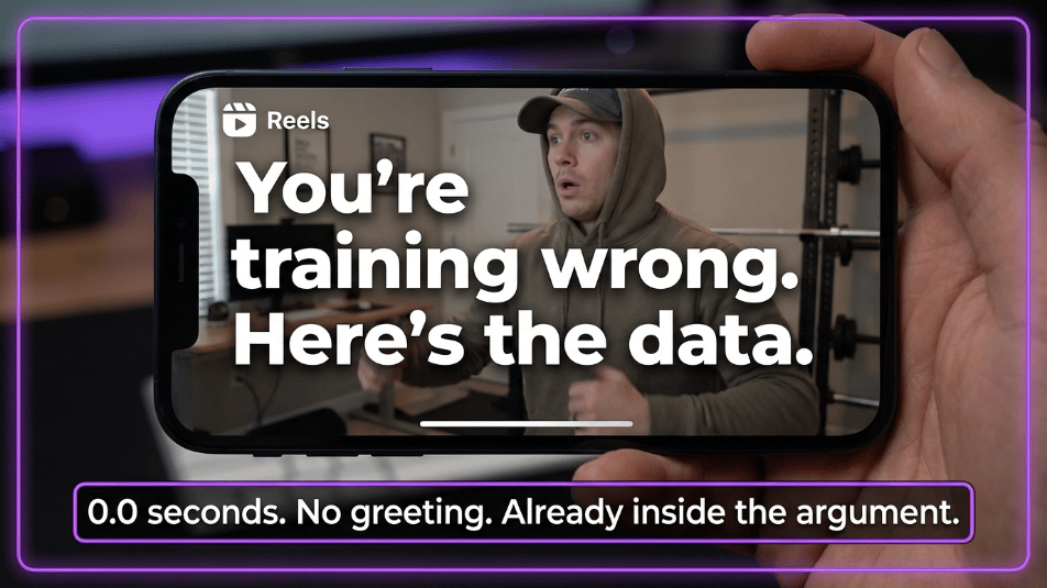 On-screen text appeared in the very first frame: You're training wrong. Here's the data. The creator was visible but silent for the first beat, caught mid-movement, mid-breath, and the explanation was already running before the viewer had consciously decided to stay.