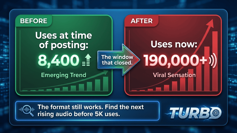 The three-part structure, the mid-thought hook, the five-second specific payoff: all of that still works. The job now is finding the next rising audio to carry it. Instagram's audio browser updates every few days. The upward arrow is the signal. Under 5,000 uses is the sweet spot. Over 50,000 is too late.