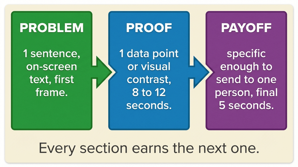 The Problem-Proof-Payoff structure produces DM shares because the payoff is built to be sent. When the resolution of a video is specific enough that the viewer immediately thinks of one person who needs to see it, they send it. That send is worth more algorithmically than a hundred passive likes.